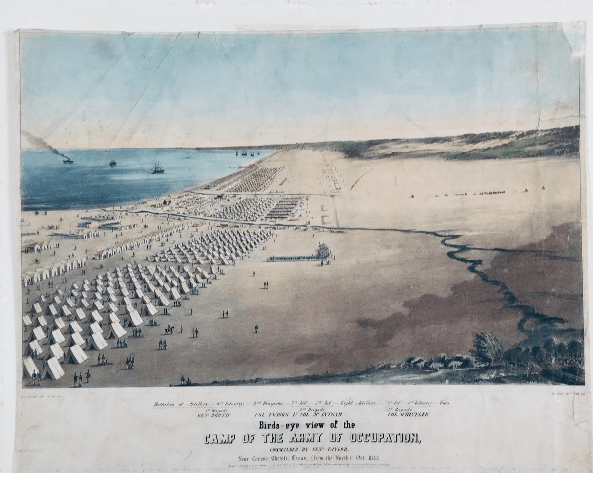 Imagen 1. Whiting Powers, Daniel, capitán 7o Infantería- Swinton G. Frederick, litógrafo. (1847) Vista a ojo de pájaro del campamento del ejército de ocupación, comandado por el general Taylor cerca de Corpus Christi, Texas, (desde el norte)octubre 1845. New York, G & W Endicott (Library of the Congress, Washington D.C. LC-USZC4-4557)