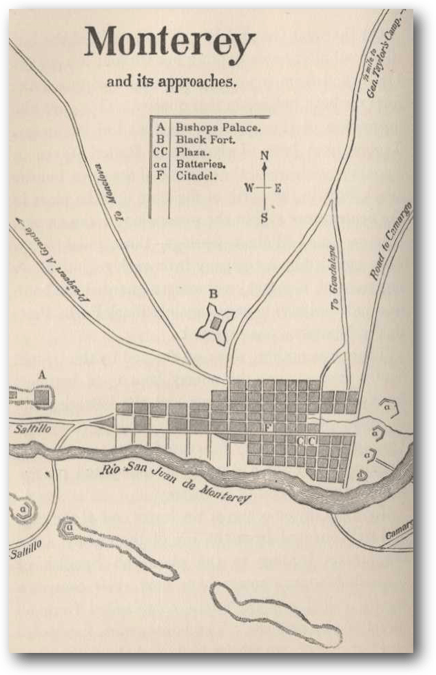 Añadido a esta inmensa defensa externa, en casi cada calle y plaza de la ciudad se colocaron barricadas y cada casa (que está construida en la manera tradicional mexicana con paredes anchas y techos de piedra) se convierte en una fortaleza. Estas fortificaciones de Monterrey (de su posición y fuerza, de las cuales nosotros aprendimos a través una dolorosa experiencia), estaban ocupadas por al menos 10,000 soldados de las tropas mexicanas y defendidas por 50 o 60 piezas de artillería pesada. Como se vería, Monterrey es una de las plazas más fortificadas del continente. (53)