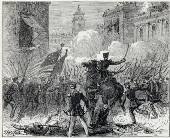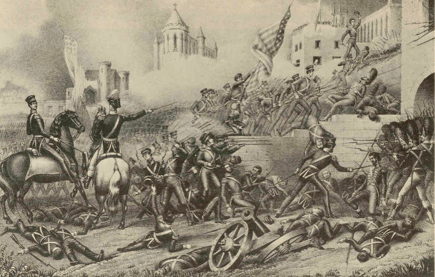 A la Batería de Bragg se le ordenó entrar a la ciudad y al 3º de Infantería se le ordenó apoyarlos. Cuando nos cruzamos con los destacamentos armados de la Ciudadela, la Batería cruzó el campo de fuego a pleno galope y ninguno fue herido. El 3º tomó una ruta más larga y llegó encubierto. Al llegar, la ciudad había sido despejada de enemigos en un área de dos cuadras alrededor de la Catedral, la cual está situada en la plaza principal, y en la cual habían estado concentrados. Los generales Quitman (65), Henderson y Lamar (66), el Coronel Wood y el Coronel Davis actuaron con gran valentía; muchos de sus hombres fueron muertos o heridos. La Batería de Bragg y el 3º de Infantería se mezclaron con ellos y compartieron las experiencias de batalla por el resto de la jornada. Aunque el fuego fue muy severo no se comparó al del día 21, a excepción de una calle que corre directamente desde la Catedral. Para cruzar esa calle se debía pasar por una verdadera lluvia de balas. Una de las piezas de artillería de Bragg estuvo peleando en esta calle con muy pocos resultados, pues el metal era muy ligero. El sargento Weightman, primer Sargento de Bragg, manejó esta pieza como un héroe y recibió un disparo en el corazón mientras preparaba sus armas. La artillería estaba dirigida hacia los mexicanos, caería en su barricada y en cuanto eso sucediera podríamos cruzar sin temor a ser heridos. Tan rápido como eran disparadas sus balas (que nos causaban el mismo efecto que si fueran nueces) se desaparecieron de la calle. Nuestros hombres cruzaron en escuadrones. “¡Vamos muchachos!” unos comenzaban a disparar de inmediato, otros se esperaban hasta que el enemigo hubiera gastado tontamente sus balas y entonces cruzaban.