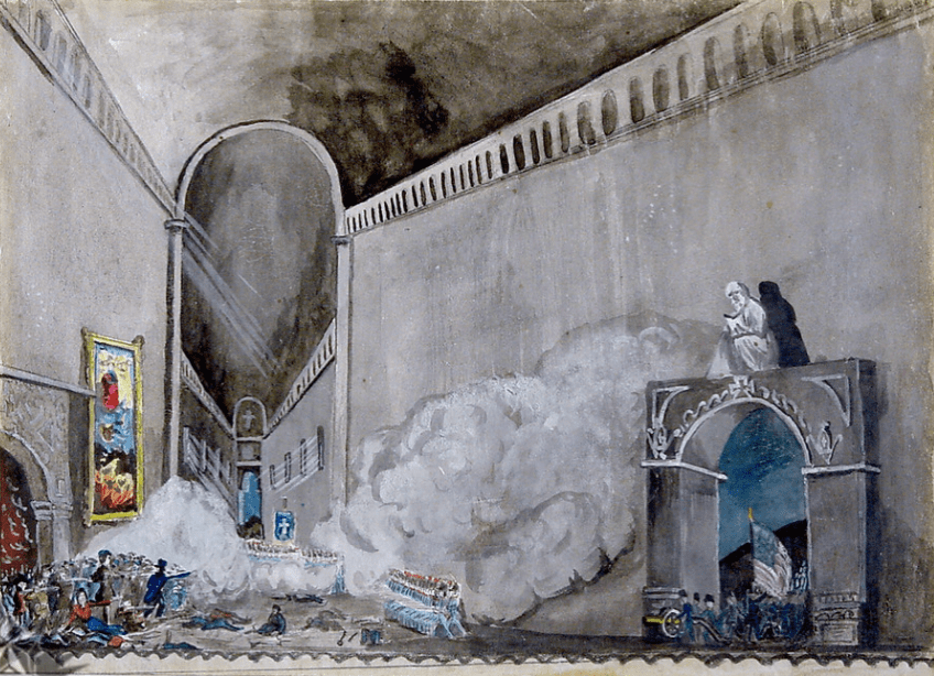 Frente a la ciudad y cerca de un cuarto de milla afuera, en medio de una planicie, permanece solitario un inmenso fuerte que cubre 3 o 4 acres de terreno. Está construido con materiales sólidos, bastiones, zanjas, etc., y es un edificio tan consistente que, en opinión de nuestros ingenieros militares, solo puede ser tomado en lo que ellos llaman aproximaciones constantes. Este fuerte está dispuesto para 32 cañones, y cubre cada avenida que va a la ciudad desde el lado este. Desde sus murallas se puede disparar cualquier tipo de metralla y fue desde este fuerte (al que nuestros muchachos llamaron después “el viejo caballero de colores” por su digna apariencia) donde se hizo fuego a nuestra avanzada el día en que llegamos.