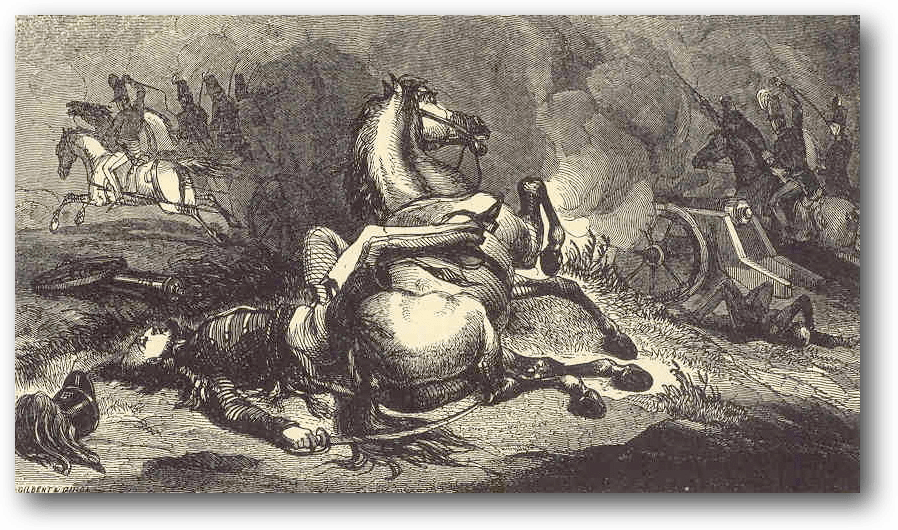 Duncan (24) pudo avanzar 50 yardas y Ringold más o menos la misma distancia al frente, abriendo diferentes puntos en la línea. La distancia fue tan buena que se podían hacer tiros precisos desde ahí. La caballería enemiga en la izquierda muy pronto se halló en una situación incómoda y difícil de mantener, así que se retiró por el flanco izquierdo, seguida por las dos piezas de artillería que estaban cercanas. La cabeza de esta columna pronto fue vista a través del bosque efectuando un ataque conjunto a nuestro flanco derecho y al convoy. Su caballería siguió la línea abierta. El 5º de infantería se internó en el bosque con el propósito de defender nuestro flanco derecho y el 3º se retrasó para poder cubrir el convoy. El 5º avanzaba en formación de cuadrado para cuando los lanceros llegaron al bosque. Se reagruparon, pero fueron rechazados y perdieron diez hombres, se retrasaron para que entraran los hombres de mosquete y continuaron su marcha hacia nuestro convoy. Los del 3º llegaron y la retirada comenzó. En lo que esto sucedía dos contingentes de armas de Ringold habían entrado al bosque a la izquierda del 5º. Llegaron a su posición justo cuando la larga línea de caballería comenzaba su retirada. Estos contingentes de armas le hicieron mucho daño a sus dos piezas de artillería que nunca abrieron fuego y apresuraron la retirada de la caballería. Mientras pasaba eso, el capitán May (25) atacaba sus líneas, pero sus baterías eran muy fuertes, dado que las defendía la infantería y la caballería, así que consideró que no había posibilidades de triunfo porque solo los atacaban 65 dragones. Ese era el estado de las cosas hasta el cierre de la primera parte de la batalla, cuando el humo de las armas y del pasto incendiado en la pradera creó una densa nube que no dejaba ver. La batalla comenzó a las 2 y eran cerca de las 4. El fuego de ambos lados cesó y tuvimos una interrupción de una hora más o menos.